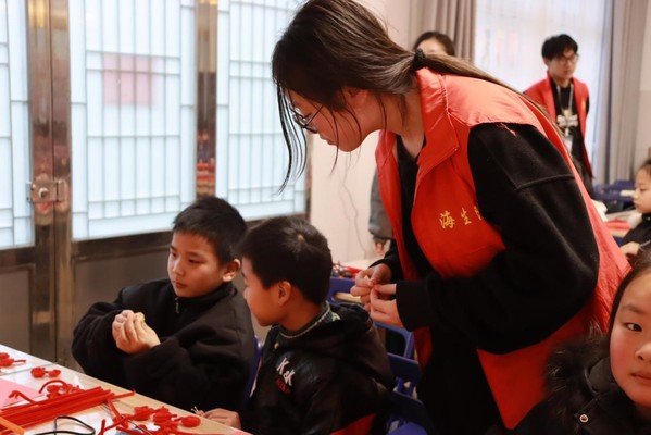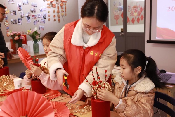 在福桶制作活动中,志愿者们认真讲解福桶制作流程,手把手教小朋友们制作吉祥花束,插入福桶。在志愿者和小朋友们的合作之下,一盆盆精致的“迎新”福桶呈现在眼前。志愿者与小朋友们进行合影留念。