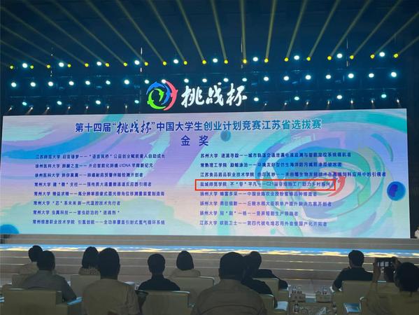 5月19日,第十四届“挑战杯”中国大学生创业计划竞赛江苏省选拔赛决赛在南京医科大学圆满落幕,我院两部作品获奖,其中:《不“苷”平凡——C21甾苷细胞工厂助力乡村振兴》荣获江苏省选拔赛决赛金奖,《异“菌”突起——菌源生态肥助力盐碱地变良田》荣获江苏省选拔赛决赛铜奖。