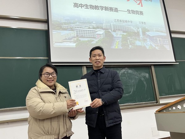 活动期间,学院副院长李祥为王景景老师颁发了兼职教师聘书,王老师作为盐城中学生物课程组骨干教师,在高中生物教学及生物竞赛指导方面成果斐然。受聘后,她将为学院生物师范生带来更多贴合教学实际的经验分享与专业指导。学院王秋语同学曾在中学受教于王景景老师,今天她满怀感恩之情向恩师敬献鲜花,以谢昔日培育之恩。