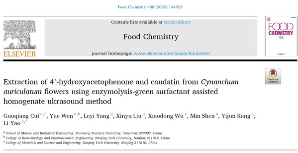 5月26日,食品领域国际权威期刊Food Chemistry(中科院一区,影响因子8.5)在线发表了我院教师崔国强博士的研究论文“Extraction of 4’-hydroxyacetophenone and caudatin from Cynanchum auriculatum flowers using enzymolysis-green surfactant assisted homogenate ultrasound method”。